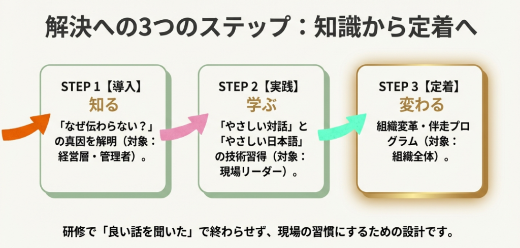 研修で「良い話を聞いた」で終わらせず、現場の景色を確実に塗り替える。 そのための具体的かつ実践的な3つのプロセスが、ここにあります。